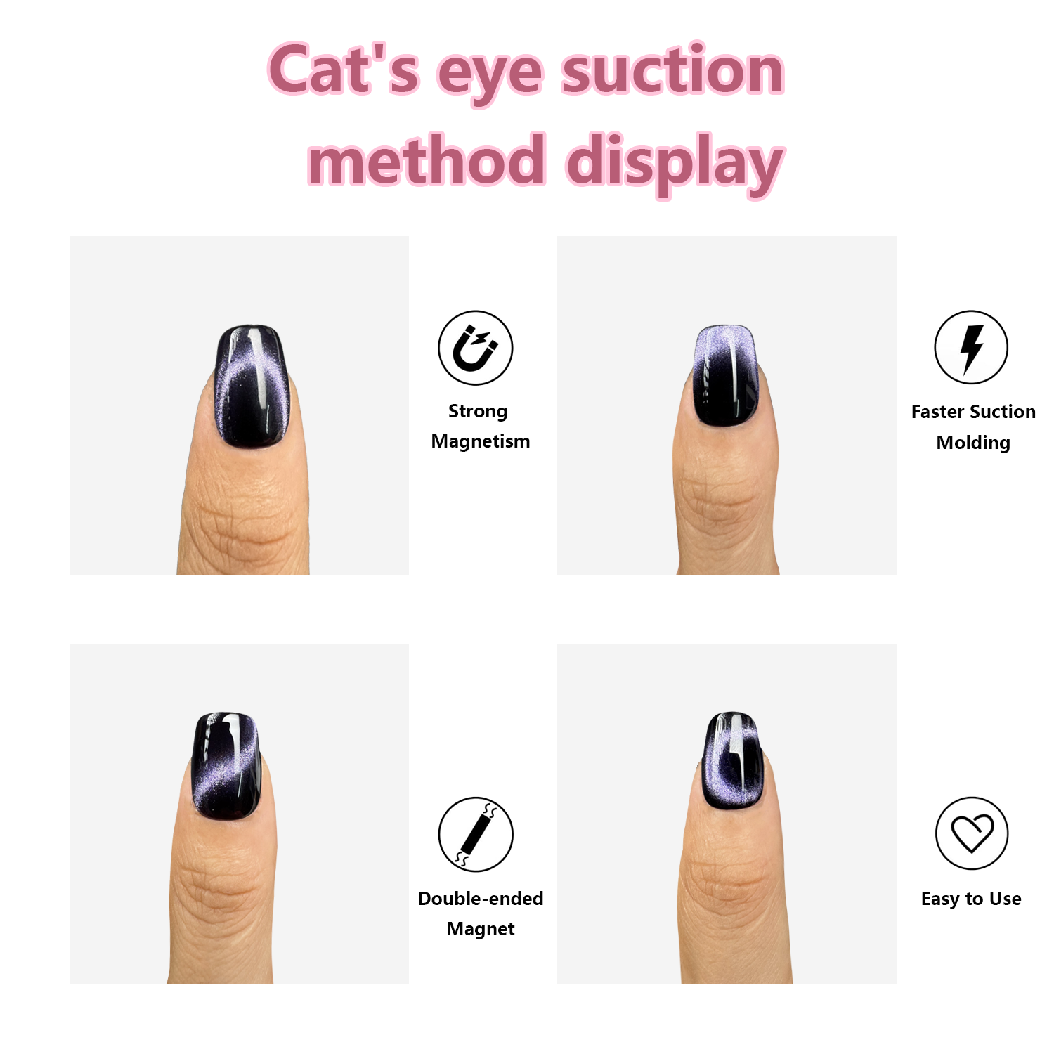 【Warm Tips】Please conduct a skin test before use with cat eye gel nail polish. Professionally formulated and only used for nails. Place the magnetic stick over the surface about 3-5mm for 5-10 secs to get your desired effect! After repeatedly sucking the cat eye color gel without any effect, the magnetic powder will become ineffective. You can add a layer to suck the cat eye gel again.![]()